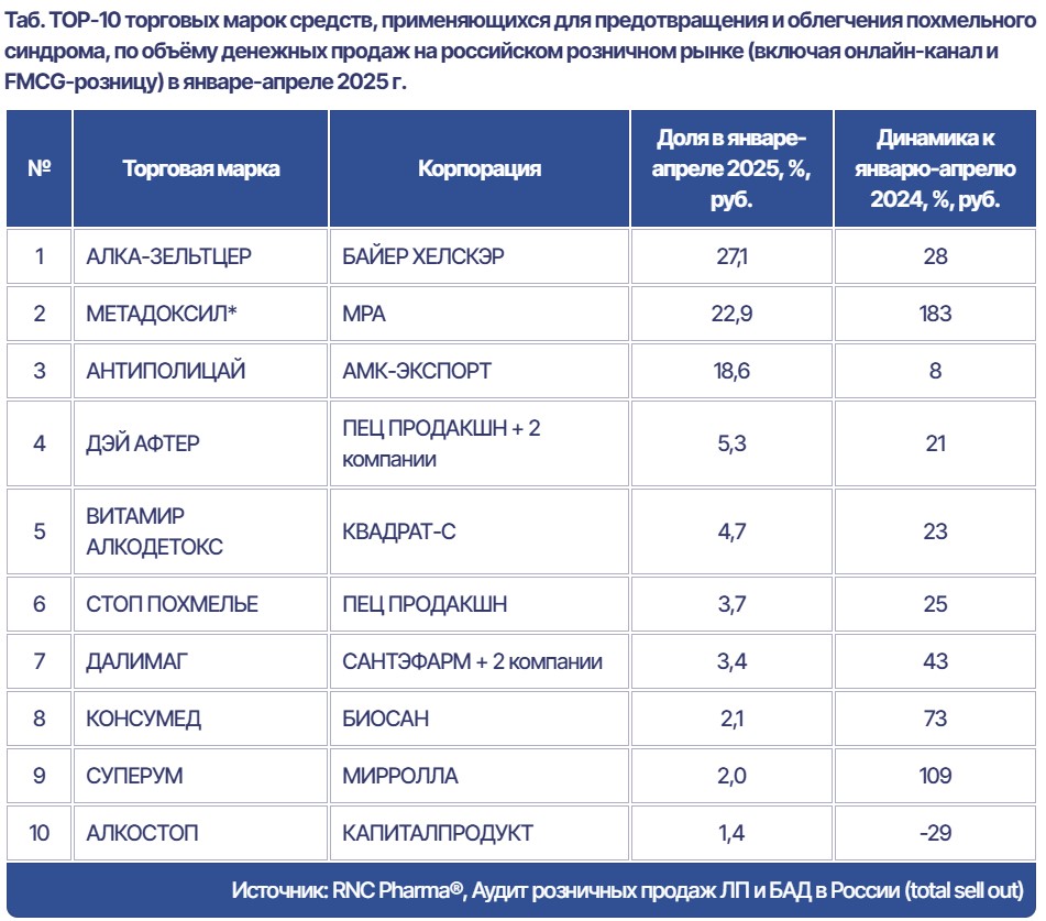 Практически все участники первой десятки характеризовались двухзначными темпами роста продаж. Помимо «Метадоксила» аналитики также выделили продукт «Суперум комплекс при похмелье» от российской производственной компании «Мирролла», продажи которого за год выросли вдвое в денежном выражении и на 73% в упаковках.