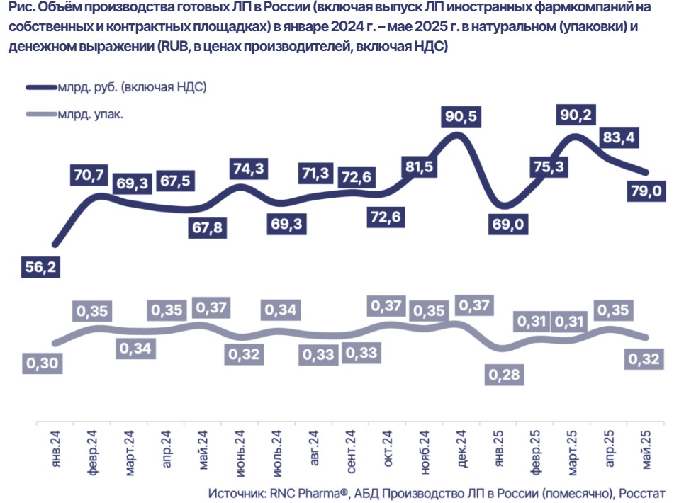 Так, в мае было произведено препаратов на 79 млрд рублей (+16,6% к маю 2024-го). Несмотря на двузначный показатель прироста, это один из самых слабых показателей за 5 месяцев. Меньшую динамику аналитики фиксировали только в феврале (+6,5%).