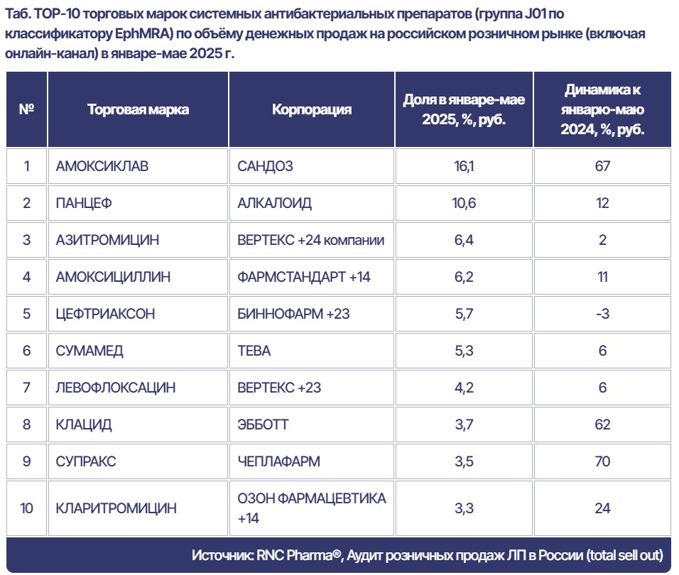 Абсолютным лидером продаж стал «Амоксиклав» от Sandoz с долей 16,1% в группе и ростом на 67%. «Аугментин» от GlaxoSmithKline показал увеличение на 57%, а «Супракс» от Cheplapharm — на 70%. Специалисты подчеркнули, что все три препарата в 2020–2023 годах сталкивались с перебоями поставок из-за дефицита сырья.