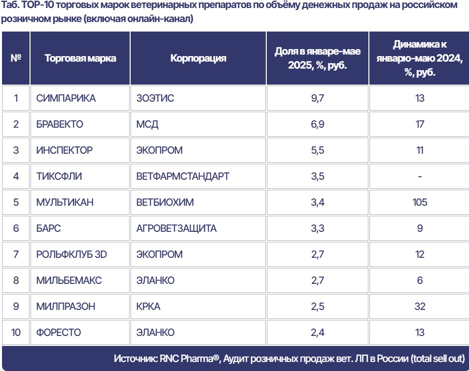 За январь — май 2025 года объем розничных продаж ветеринарных препаратов в России составил 21,2 млрд рублей в розничных ценах. Это на 14,4% превышает показатели аналогичного периода 2024 года в рублевом выражении. Однако, как следует из данных аналитической компании RNC Pharma, в физическом объеме (минимальных единицах дозирования, МЕД) рынок сократился на 2,9%, достигнув 40,4 млрд единиц.