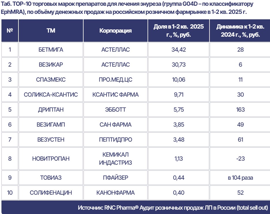 Российский рынок препаратов от энуреза демонстрирует стабильный рост, поддерживаемый как увеличением потребления, так и восстановлением поставок ранее дефицитных лекарств. Так, согласно данным аналитической компании RNC Pharma, в первой половине 2025 года россияне приобрели более 1 млн упаковок таких лекарств на сумму свыше 1,1 млрд рублей. В денежном выражении рост составил 22,5%, в натуральном — 17,1% по сравнению с аналогичным периодом 2024 года.