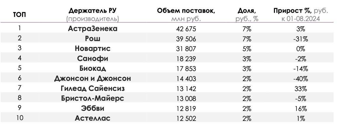 При этом падение объемов поставок продемонстрировала половина топ-10 производителей ЛС (держателей регистрационных удостоверений) — участников рынка госзакупок. Антилидером десятки стал Johnson & Johnson: с января по август объем поставок его препаратов сократился на 40%, до 14,4 млрд рублей. Сейчас компания занимает шестое место с долей рынка 2%. На 31%, до 39,5 млрд рублей, сократились поставки Roche; производитель находится на втором месте рейтинга с долей рынка 7%. Biocad, единственная российская компания, входящая в топ-10, потерял 14% и занимает пятое место с 17,9 млрд рублей (3% рынка). На 5%, до 13 млрд рублей, уменьшился объем поставок Bristol-Myers (2%, восьмое место); на 2%, до 18,2 млрд рублей, — Sanofi (3% рынка, четвертое место).