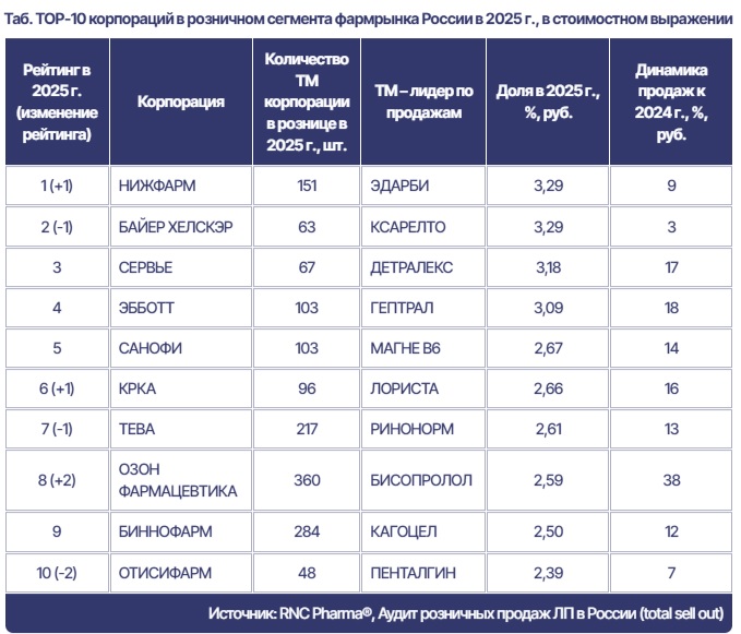 Среди отечественных компаний особенно отличилась «Озон Фармацевтика» — за прошлый год продажи выросли на 38% в рублях и 19,5% в упаковках, что позволило ей подняться на две позиции, до восьмого места, заняв 2,59% рынка. «Такой рост обусловлен стремительным расширением портфеля производителя — в минувшем году компания представляла в рознице 360 торговых марок», — сообщают аналитики, отмечая, что это абсолютный рекорд десятки.