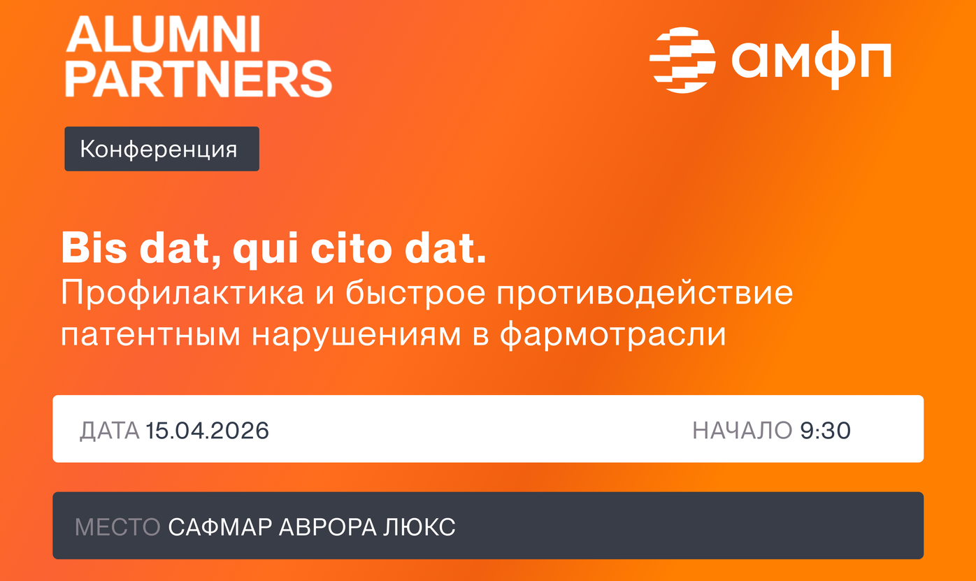 Конференция АМФП и ALUMNI Partners «Bis dat, qui cito dat. Профилактика и быстрое противодействие патентным нарушениям в фармотрасли» объединит представителей регуляторов и фармацевтического бизнеса для профессионального анализа накопленной практики и выработки сбалансированных подходов к защите прав патентообладателей.
